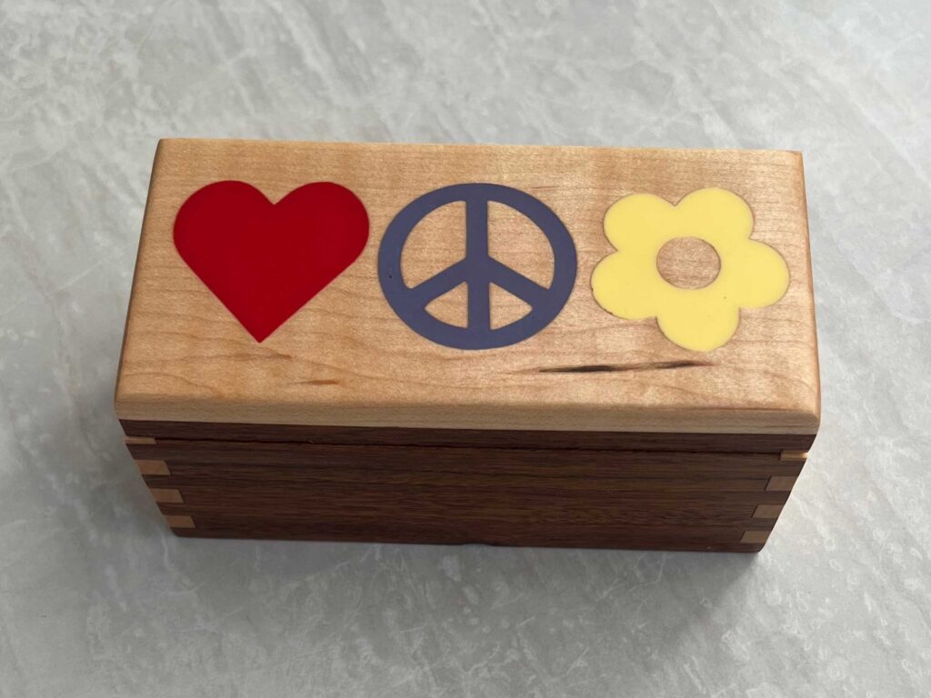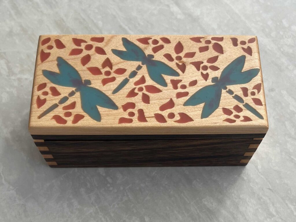 These Small Ring Boxes measure about 5.25 in x 2.5 in x 2.5 in. Each box comes with a soft jewelry insert to hold rings snugly. There are a wide variety of designs including: Greek Key, Dragon Flies, Heart Flowers, Love, Olive Branch, Sandia Mountains, Butterflies, Orchid and Stripes.